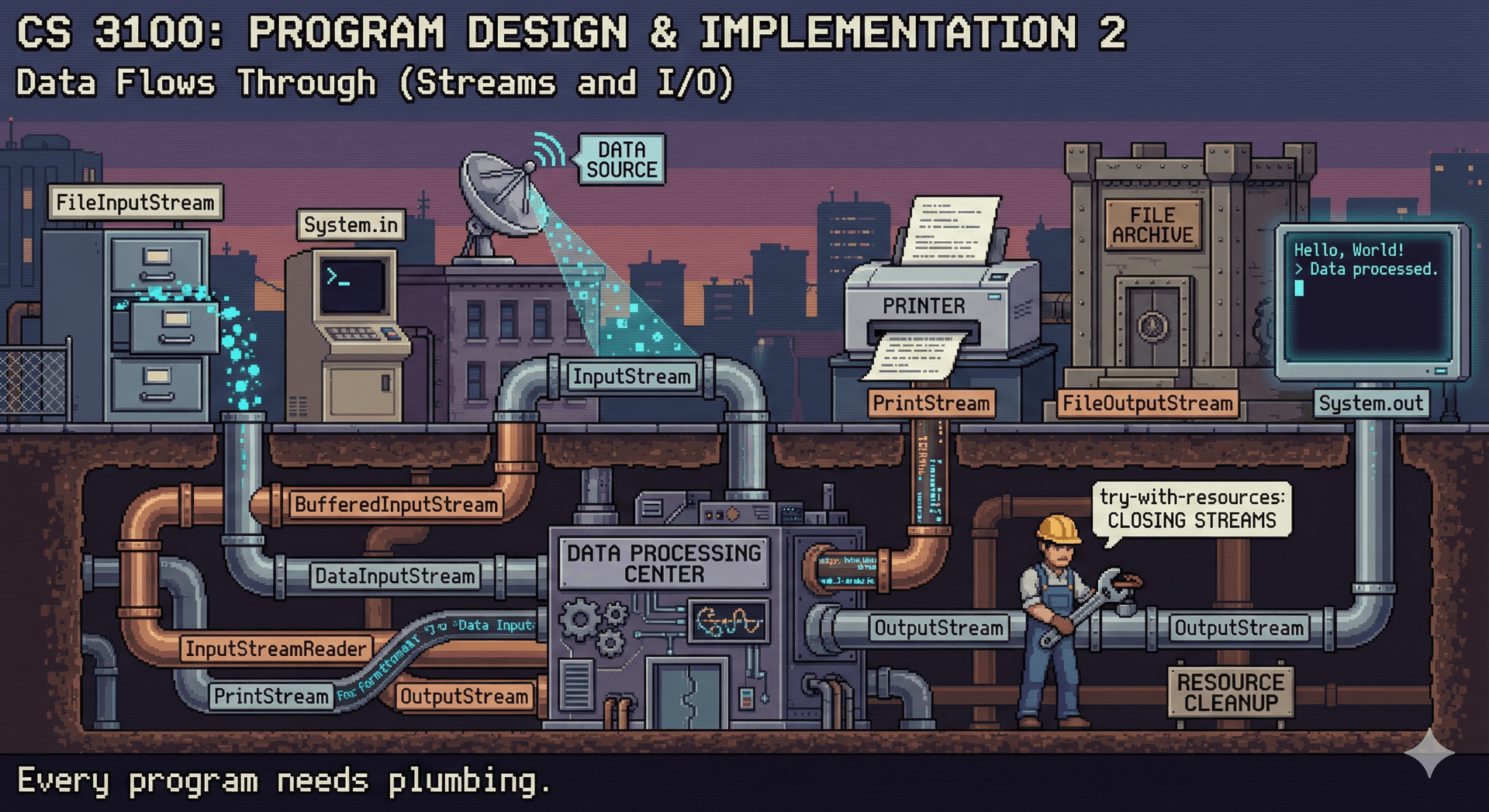 | Streams | Uniform abstraction for I/O; InputStream, OutputStream |