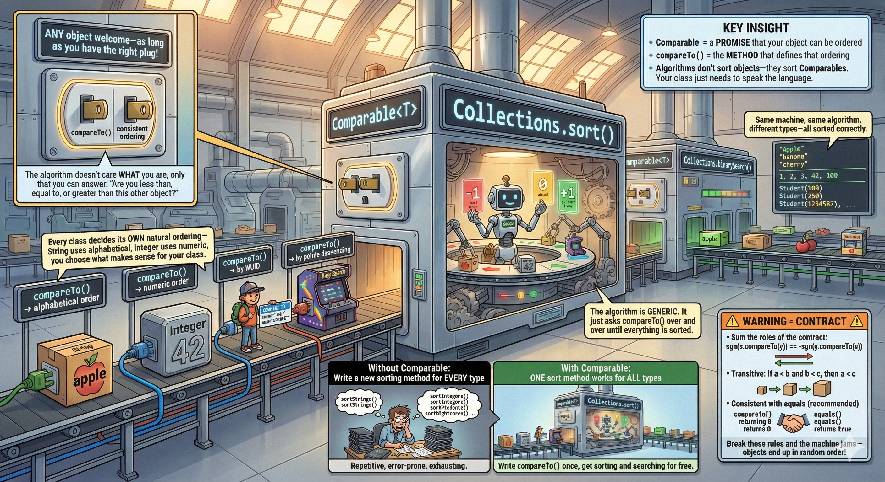 - Object contracts (toString, equals, hashCode, compareTo) enable Collections to work